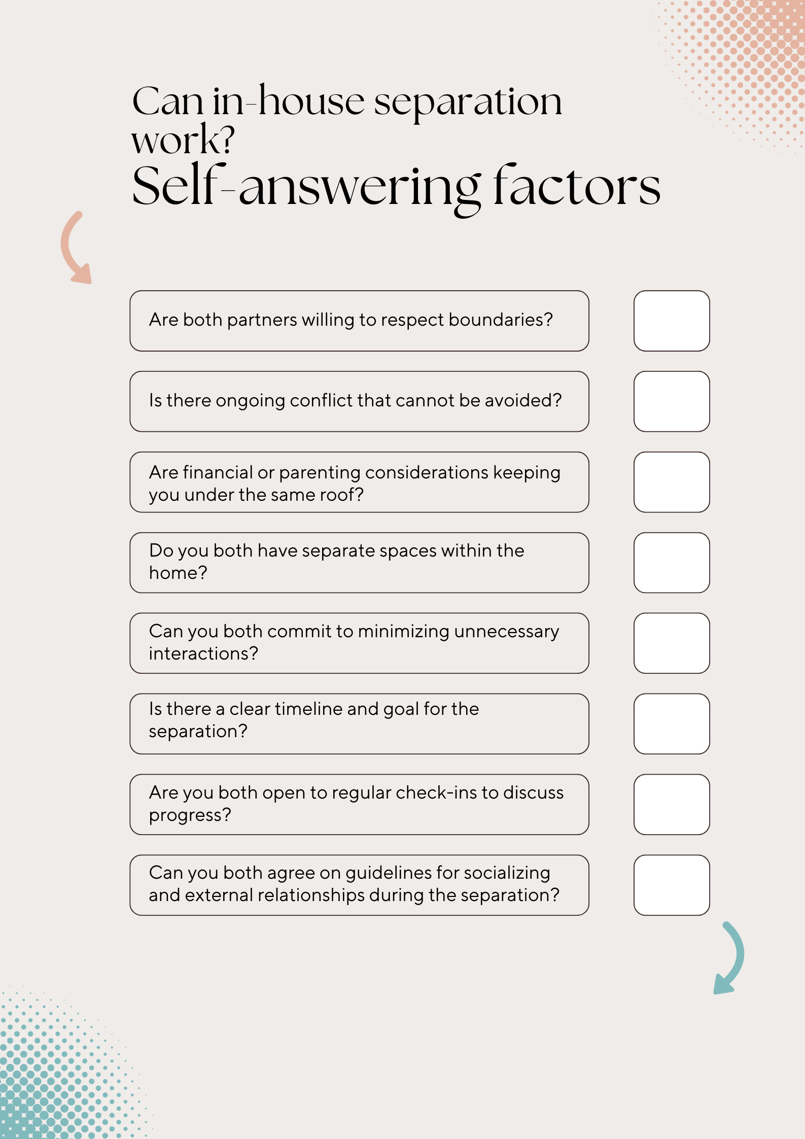 - Without clear boundaries, in-house separation can lead to blurred lines, confusion, and mixed signals, preventing either partner from gaining the clarity needed.