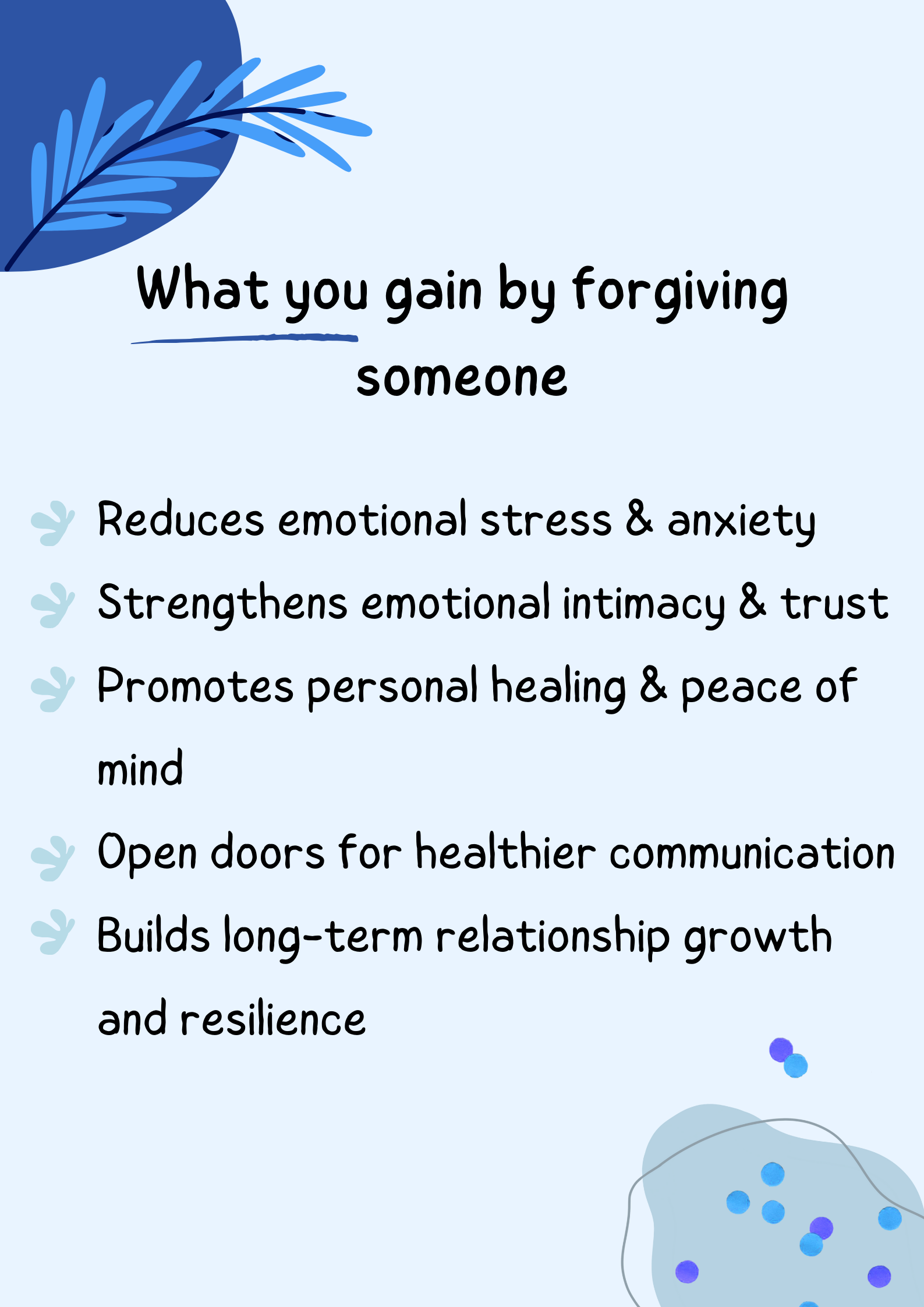 Forgiveness isn’t just for your partner; it also benefits you, as releasing the anger and resentment will improve your own psychological and emotional wellbeing.